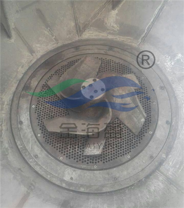 葉輪采用八翼敞開式伏克斯轉子,轉子材質為精細鑄鋼和不銹鋼兩種,(刀片材質為工具鋼T9.刀片用螺釘緊固在轉盤碎解葉片前方,磨損后可更換。只用于鑄鋼葉輪上。)轉子葉片的前緣立面有15°的前傾角,造成局部的強烈制流而使漿液推涌向篩板;轉子的錐面和上導面陡降的流線葉片有力地將漿流從吸向篩板;葉片后端的翹角,主要是使葉片與篩板之間形成局部負壓區,回吸漿液,避免篩孔堵塞,加快出漿速度。